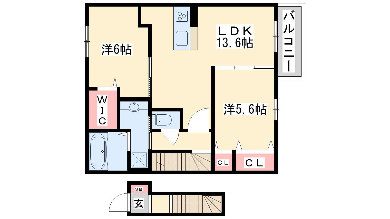 - LDK13.6帖、洋室6帖、洋室5.6帖