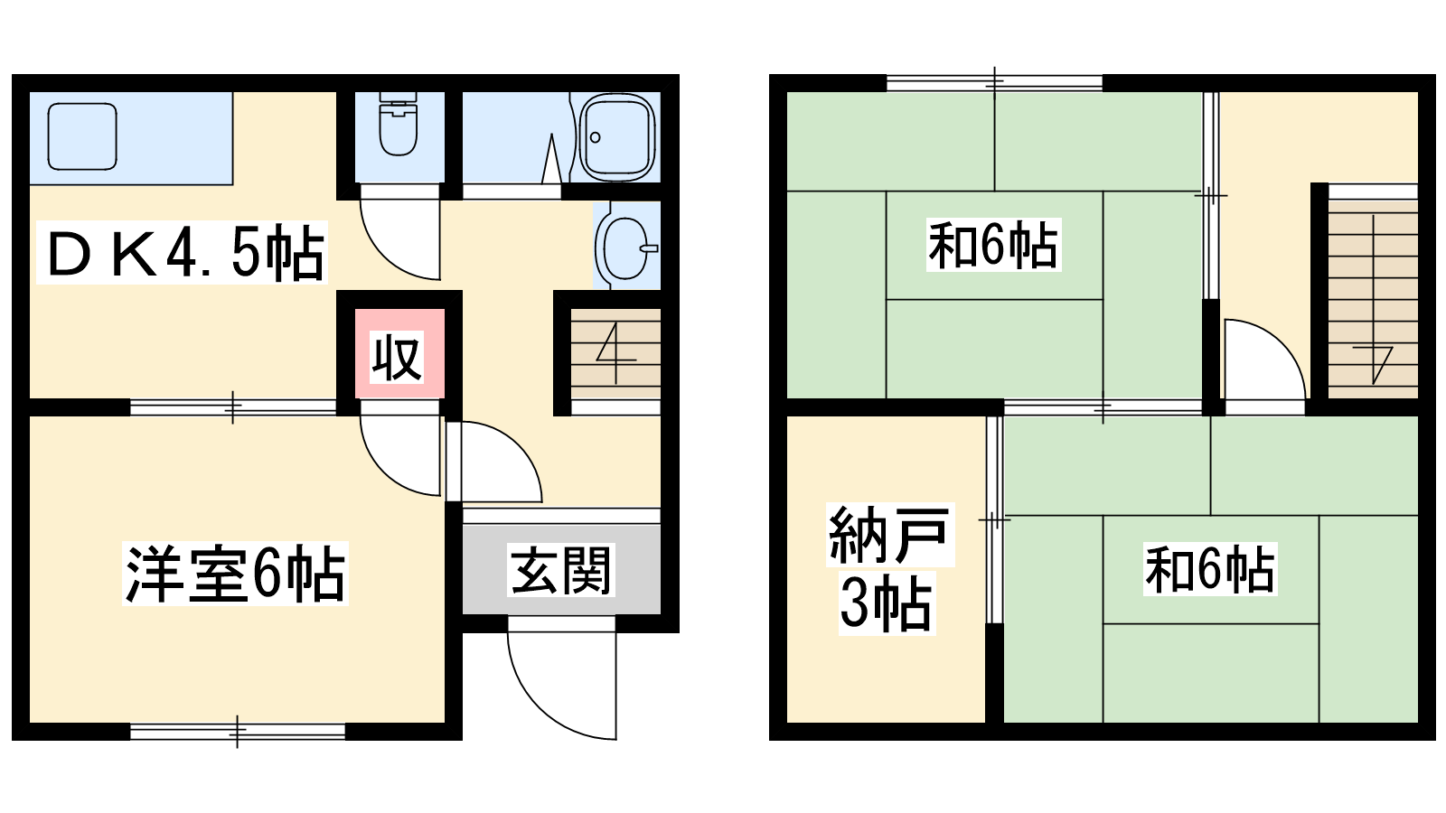 - DK4.5帖、洋室6帖、和室6帖、和室6帖
