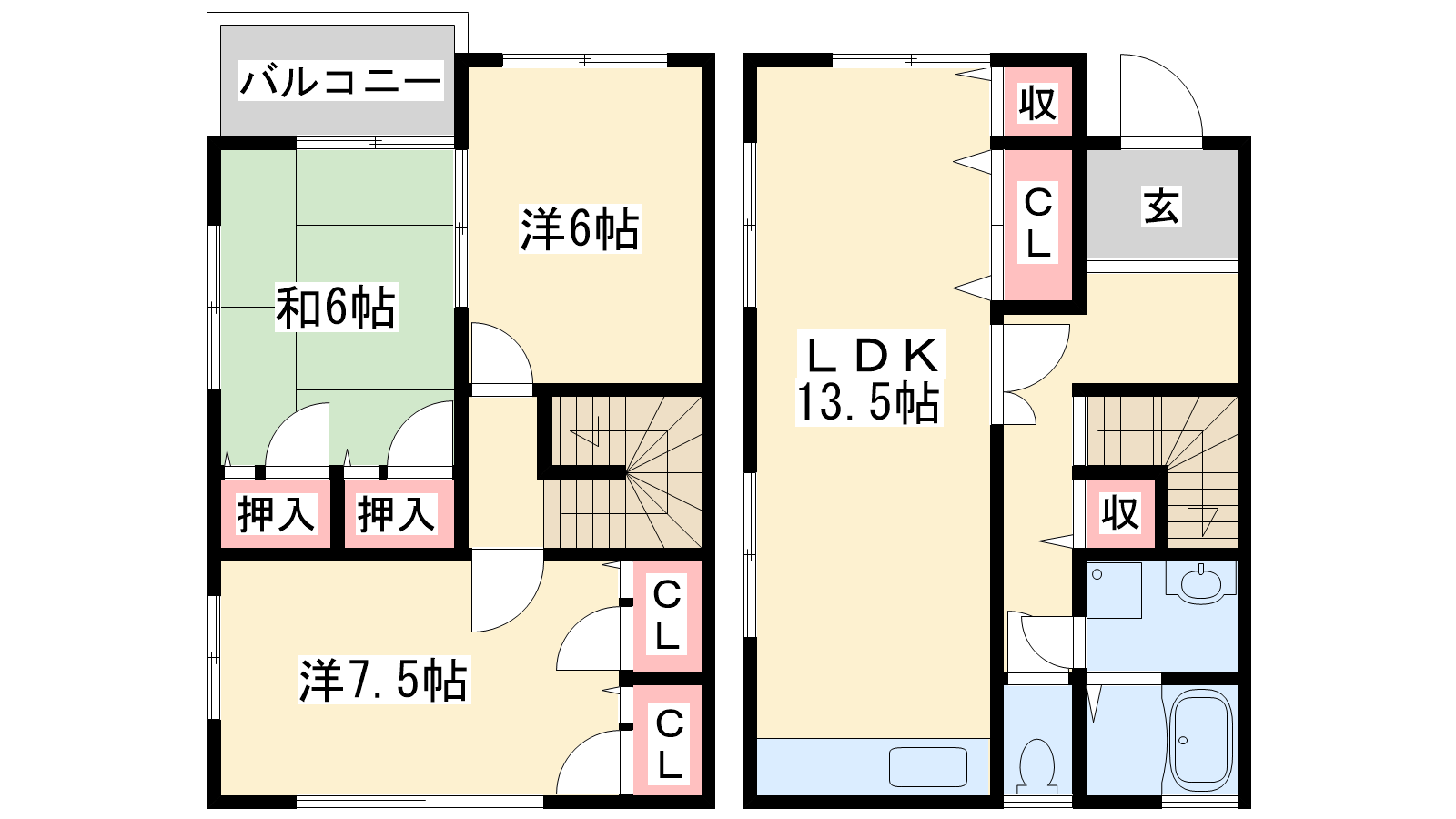 - LDK13.5帖、洋室7.5帖、洋室6帖、和室6帖