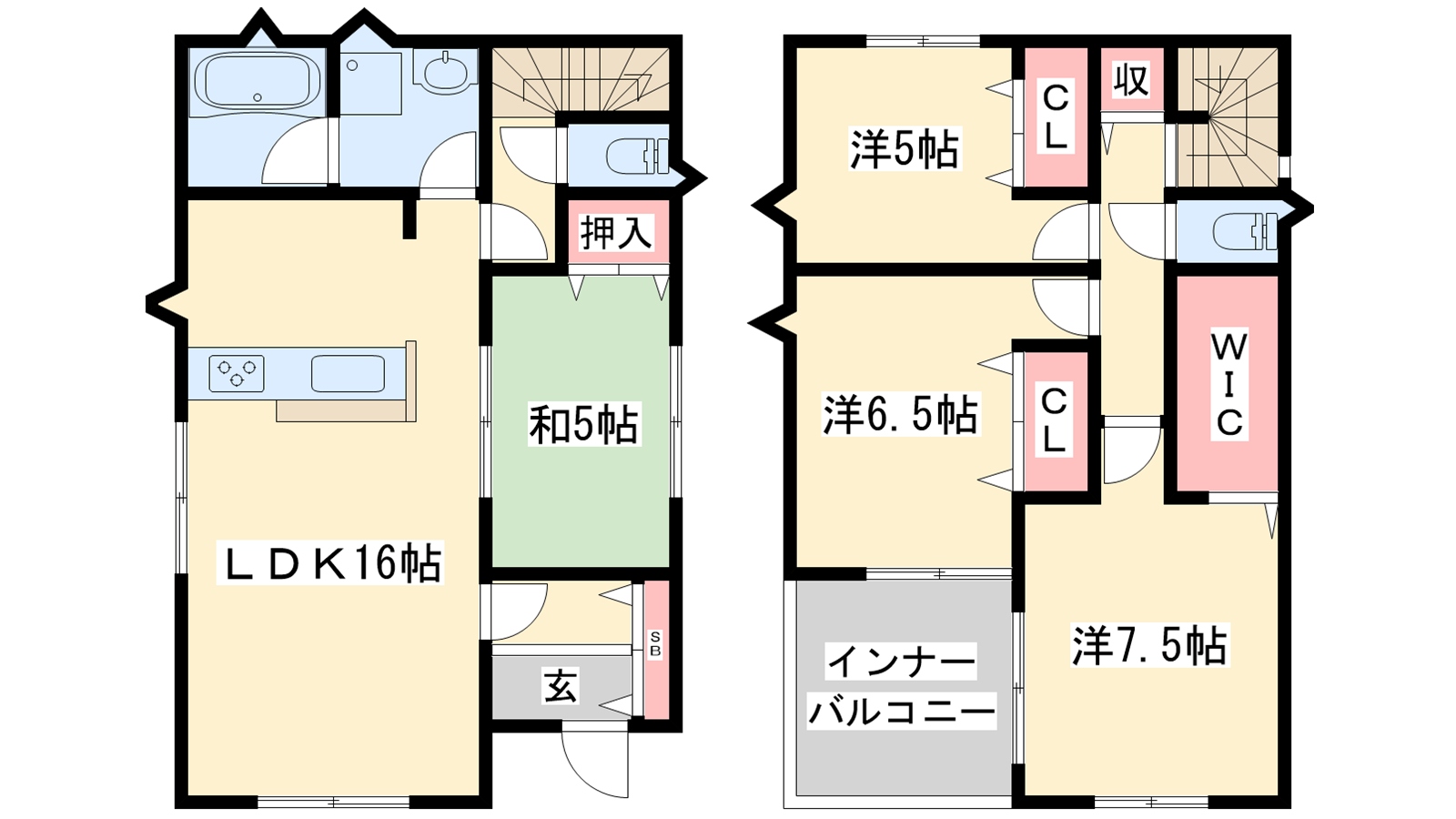 - LDK16帖、洋室7.5帖、洋室6.5帖、洋室5帖、和室5帖