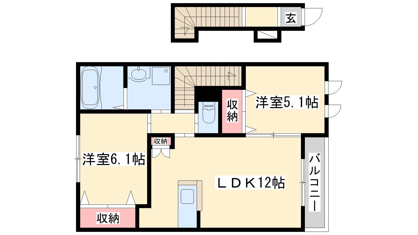 - LDK12帖、洋室6.1帖、洋室5.1帖