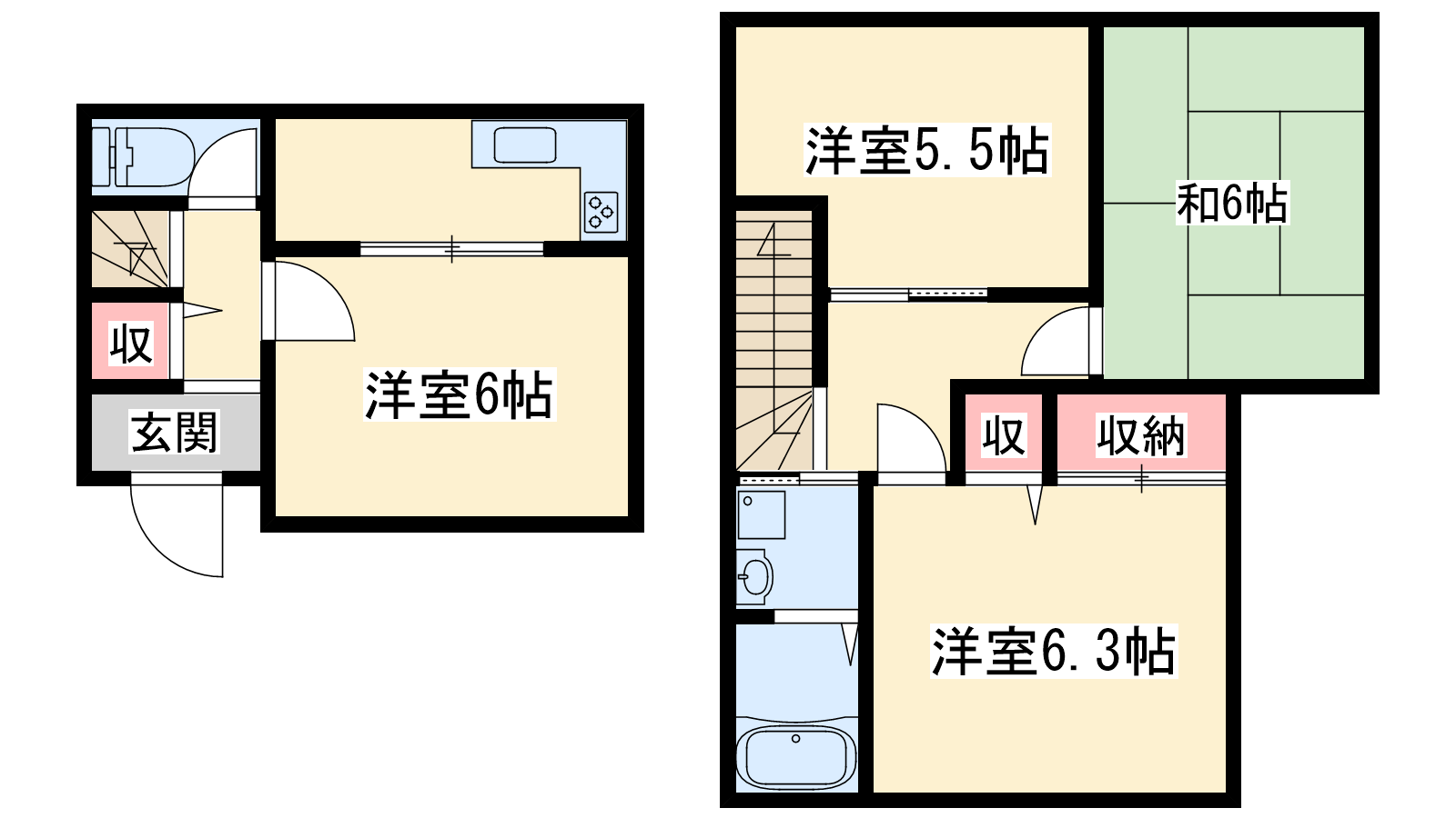 - DK6帖、洋室6.3帖、和室6帖、洋室5.5帖