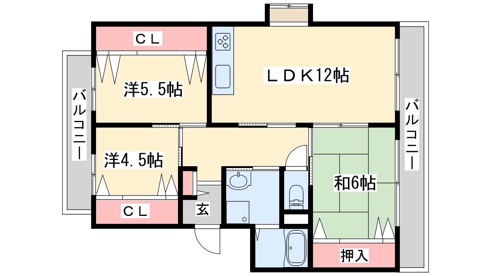 - LDK12帖、洋室5.5帖、洋室4.5帖、和室6帖