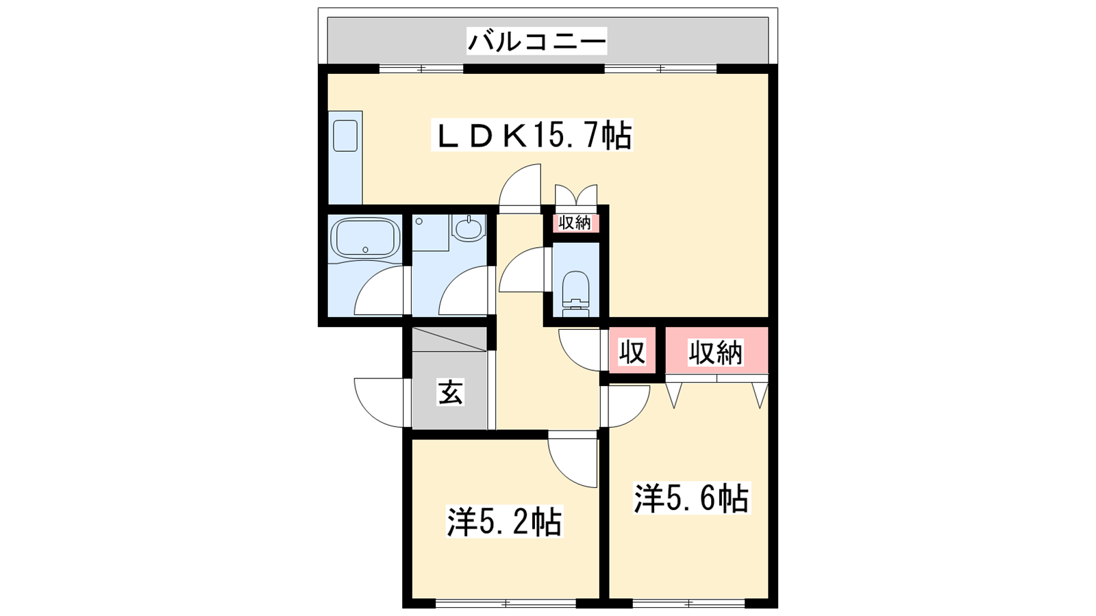 - LDK15.7帖、洋室5.6帖、洋室5.2帖