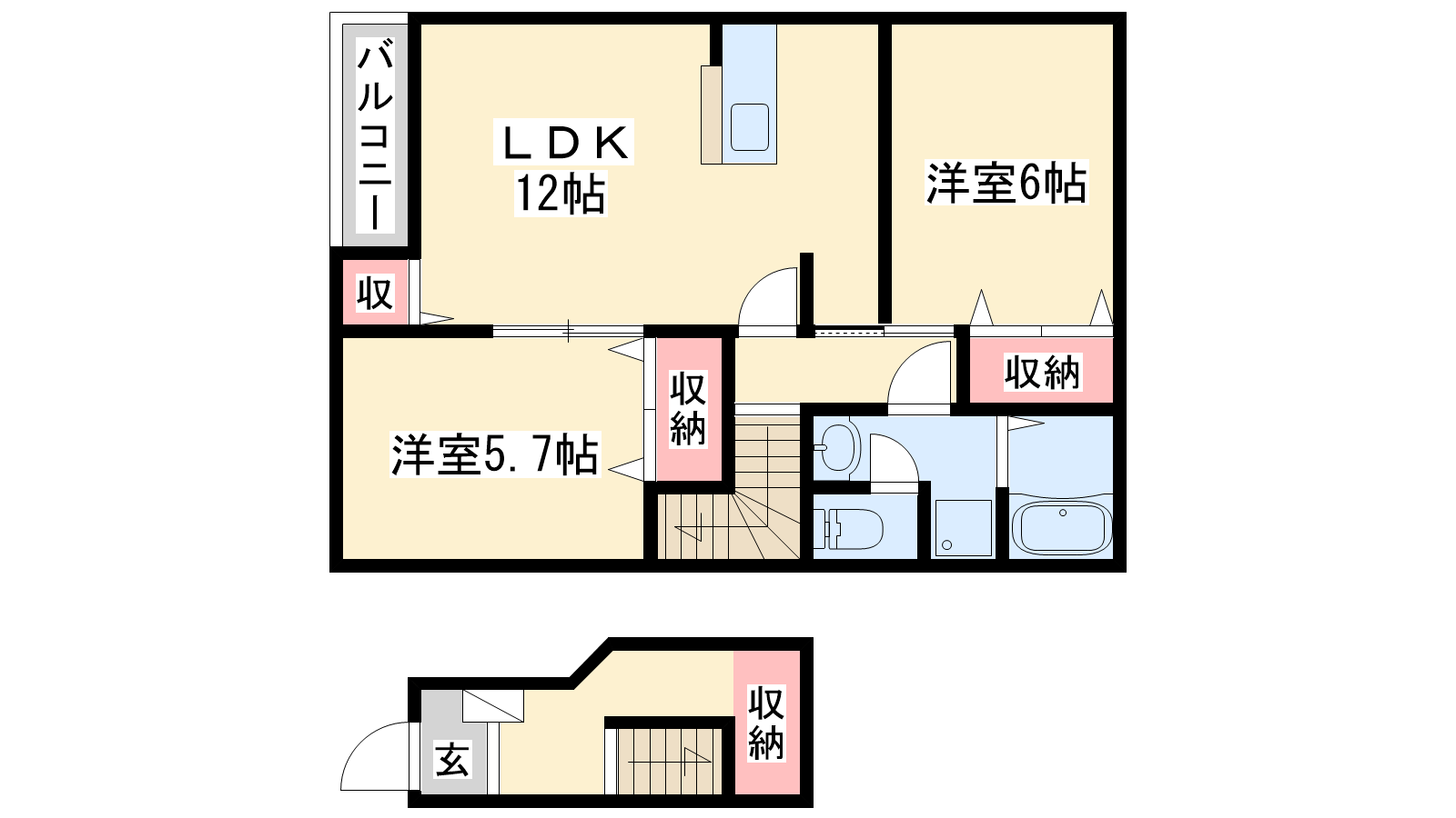 - LDK12帖、洋室6帖、洋室5.7帖