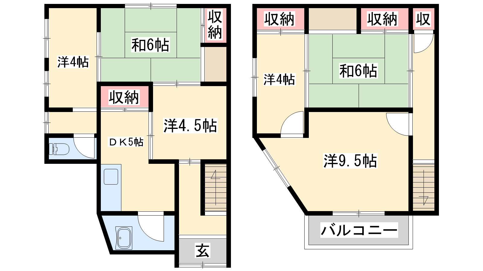 - DK5帖、洋室9.5帖、洋室4.5帖、和室6帖、和室6帖