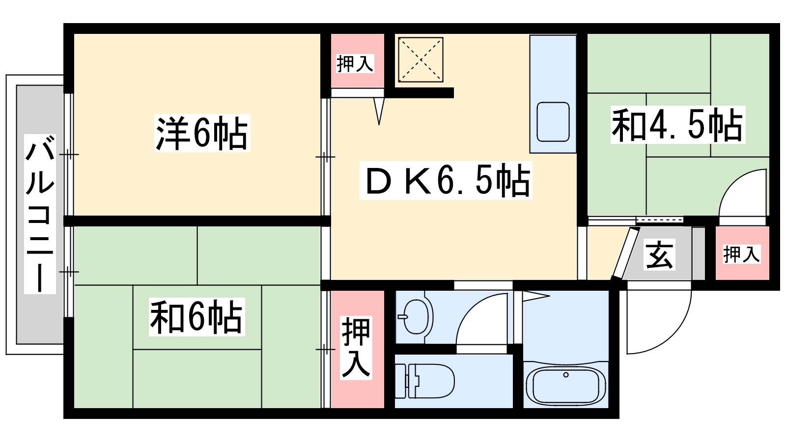 - DK6.5帖、洋室6帖、和室6帖、和室4.5帖