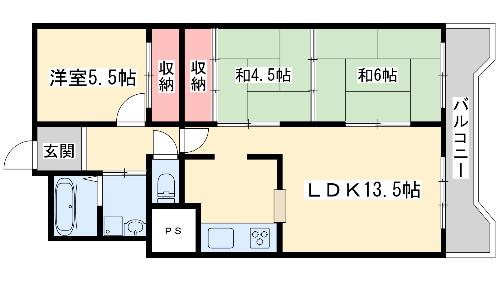- LDK13.5帖、和室6帖、洋室5.5帖、洋室4.5帖