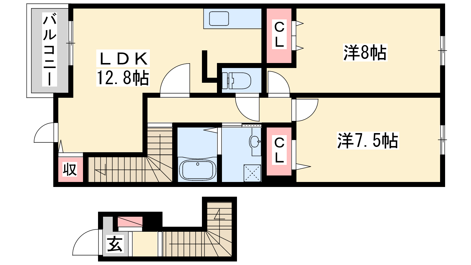- LDK12.8帖、洋室8帖、洋室7.5帖