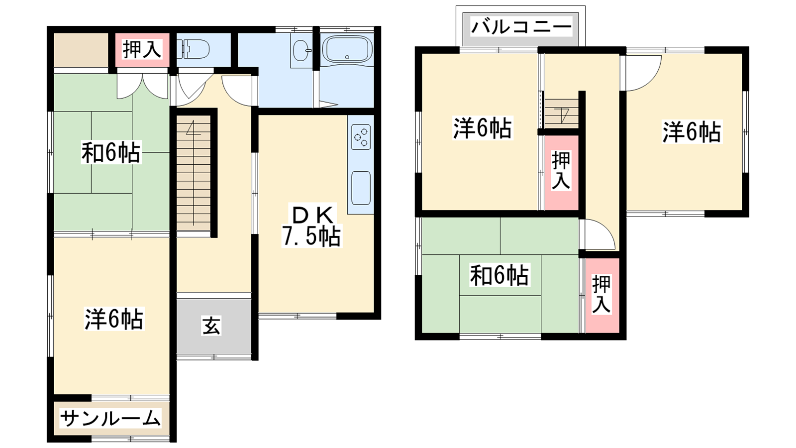 - DK7.5帖、洋室6帖、洋室6帖、洋室6帖、和室6帖、和室6帖