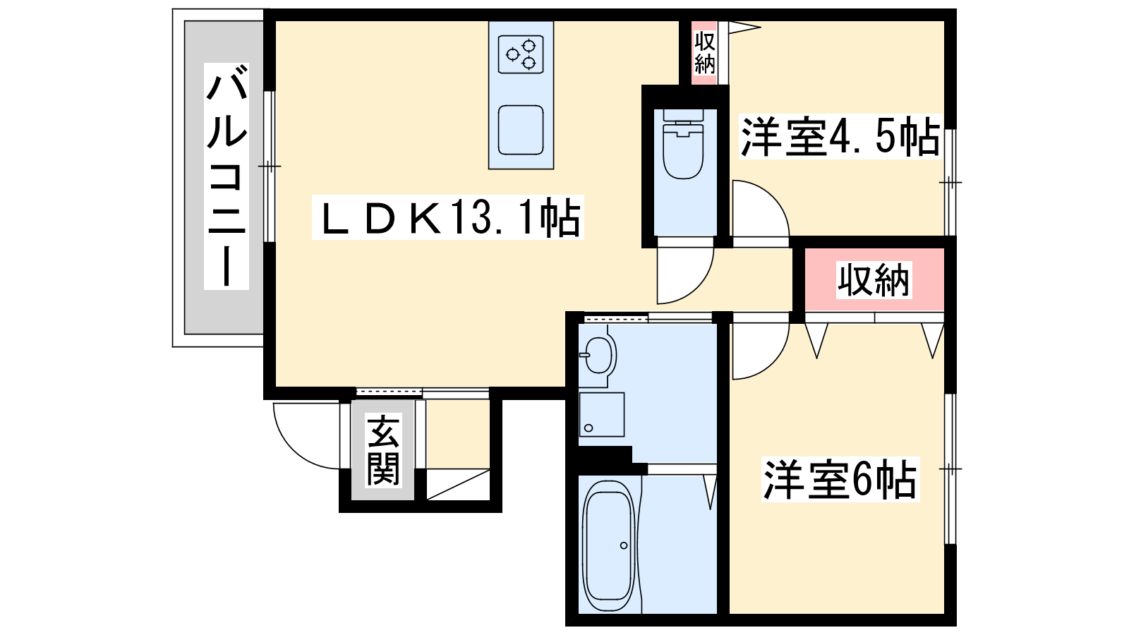 - LDK13.1帖、洋室6帖、洋室4.5帖
