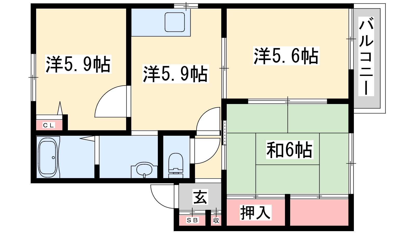 - K5.9帖、和室6帖、洋室5.9帖、洋室5.6帖