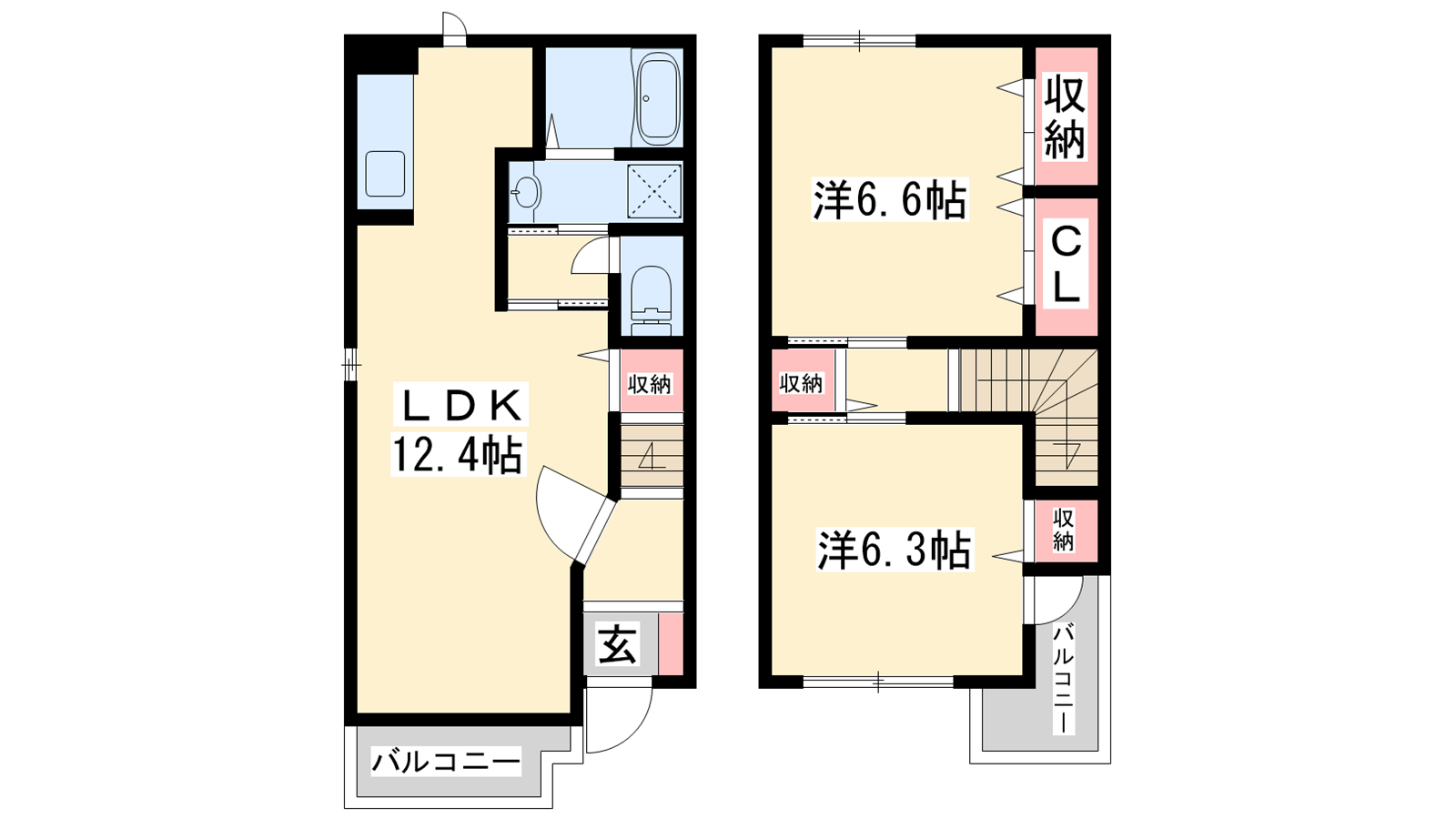 - LDK12.4帖、洋室6.6帖、洋室6.3帖
