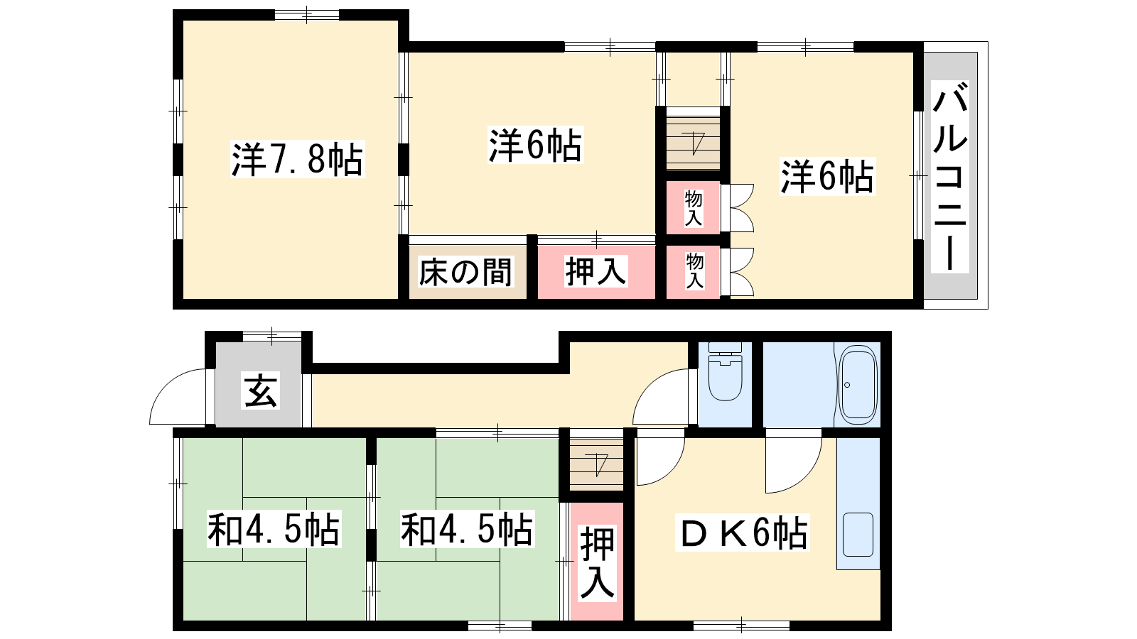 - DK6帖、洋室7.8帖、洋室6帖、洋室6帖、和室4.5帖、和室4.5帖