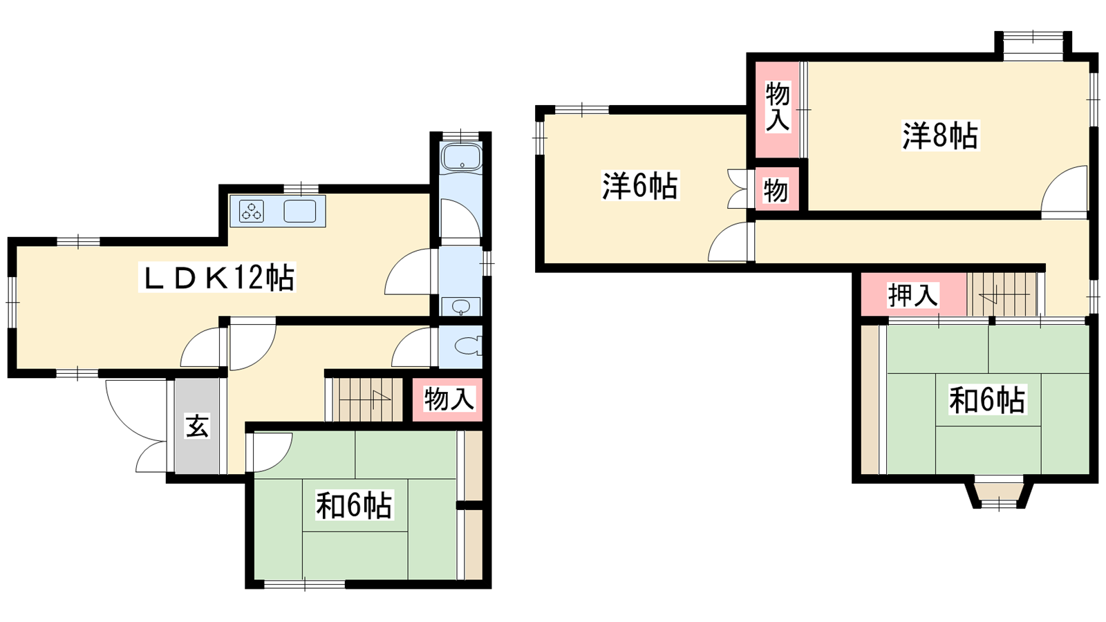 - LDK12帖、洋室8帖、洋室6帖、和室6帖、和室6帖