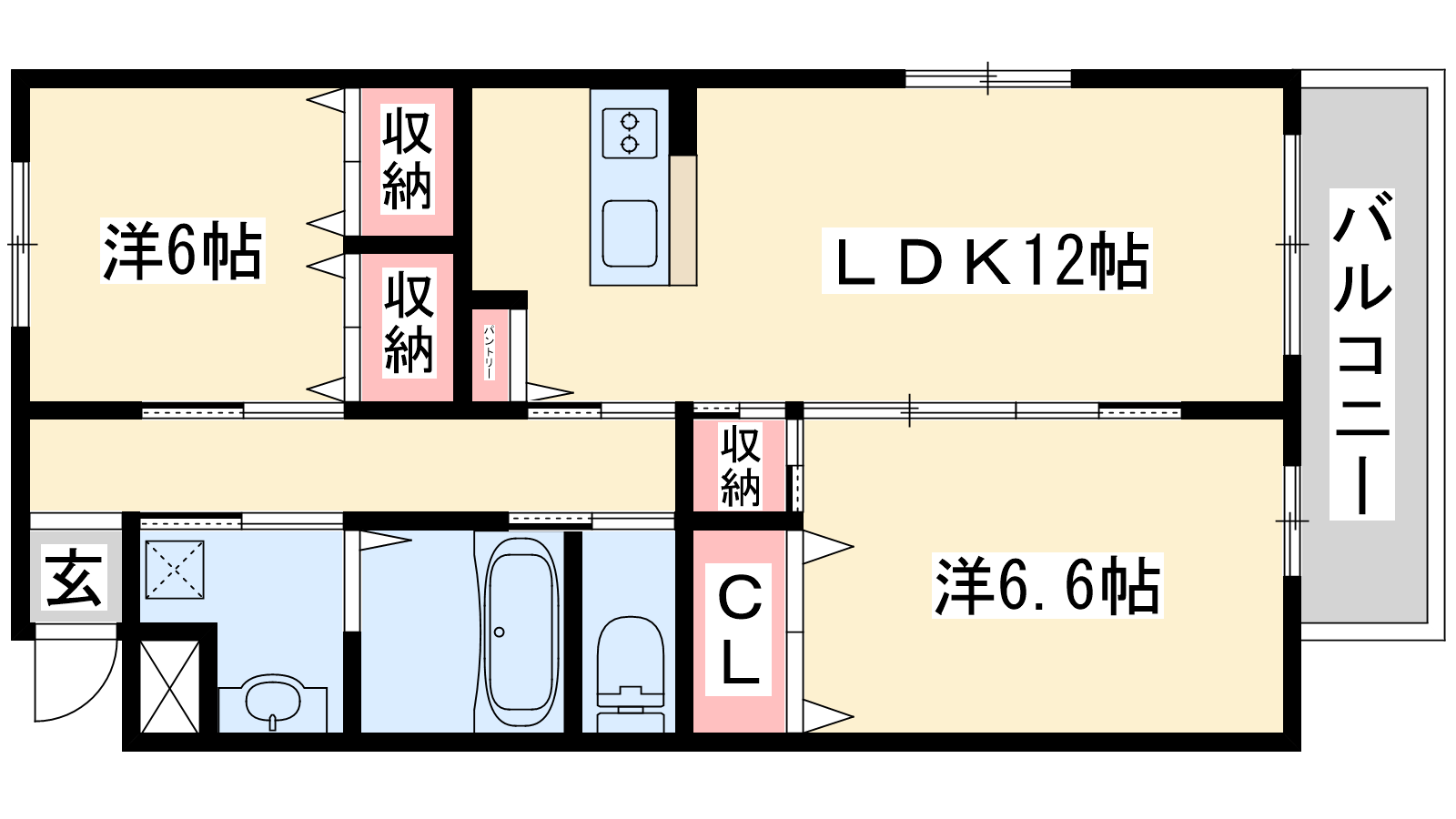 - LDK12帖、洋室6.6帖、洋室6帖