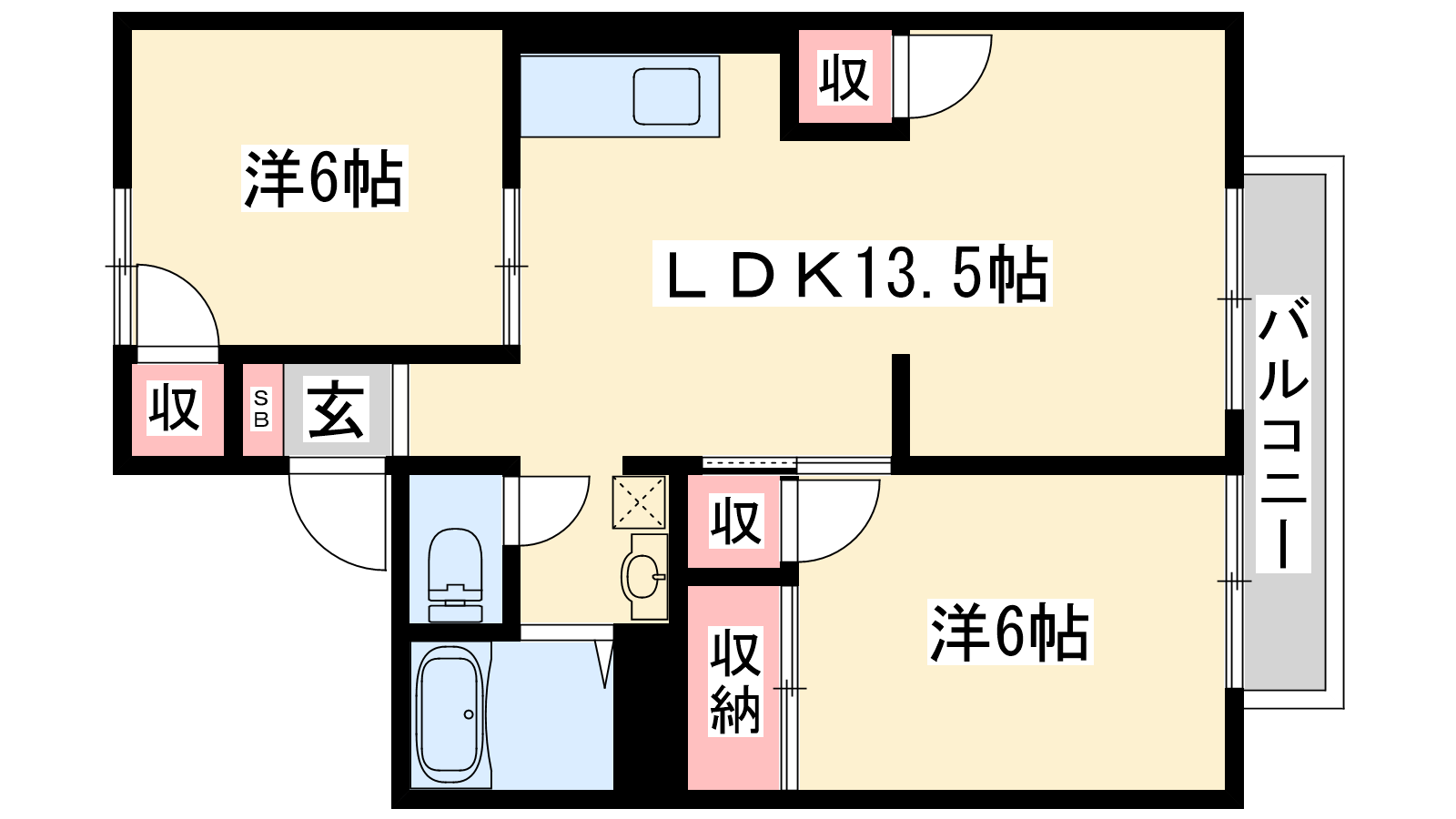 - LDK13.5帖、洋室6帖、洋室6帖