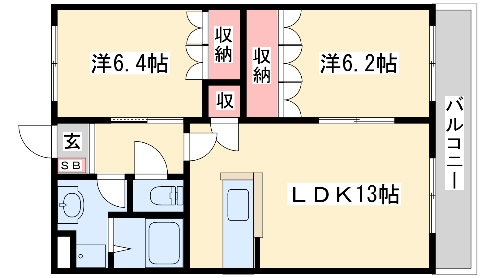 - LDK13帖、洋室6.4帖、洋室6.2帖