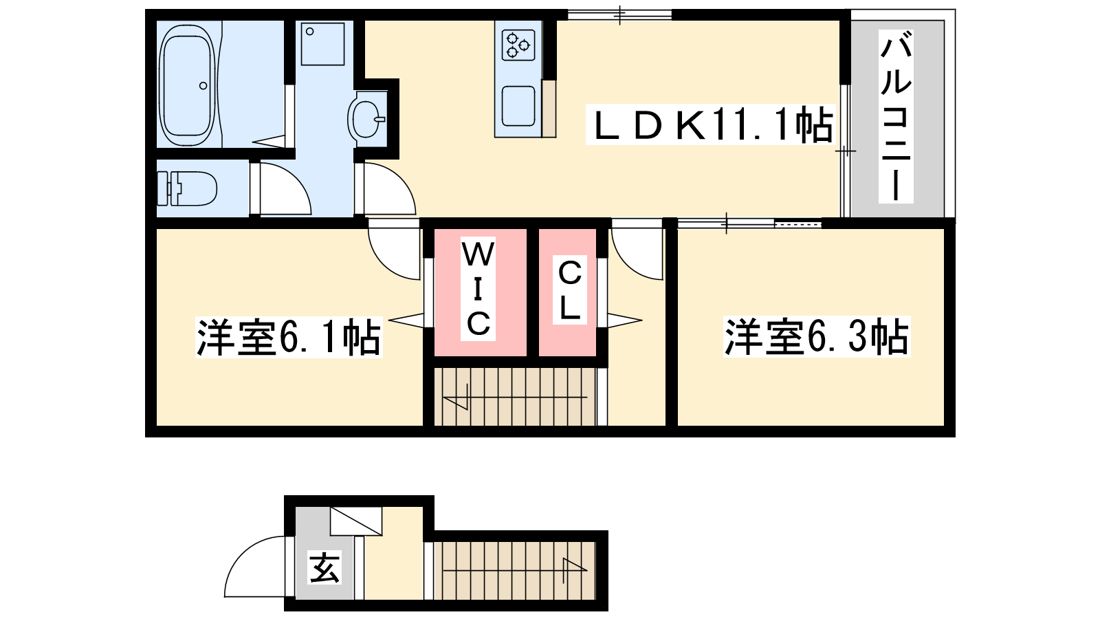 - LDK11.1帖、洋室6.3帖、洋室6.1帖