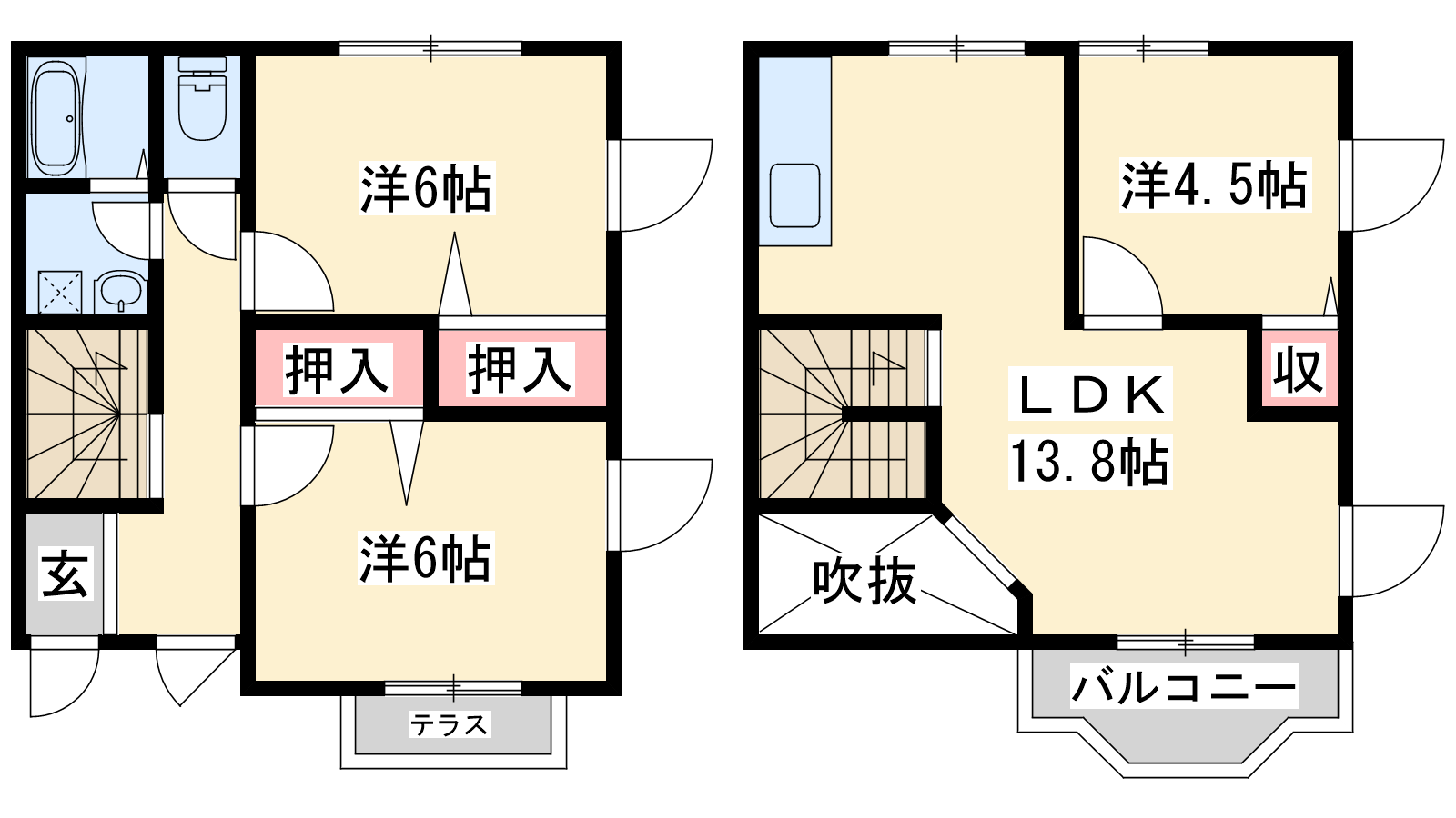 - LDK13.8帖、洋室6帖、洋室6帖、洋室4.5帖