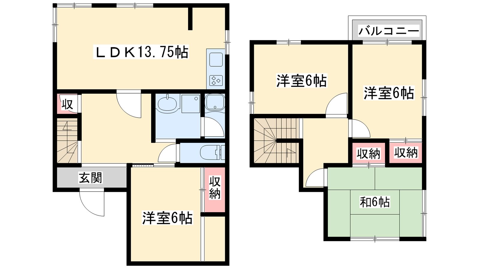 - LDK13.75帖、洋室6帖、洋室6帖、洋室6帖、和室6帖
