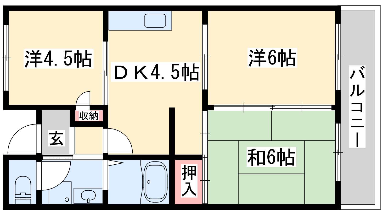 - DK4.5帖、洋室6帖、洋室4.5帖、和室6帖