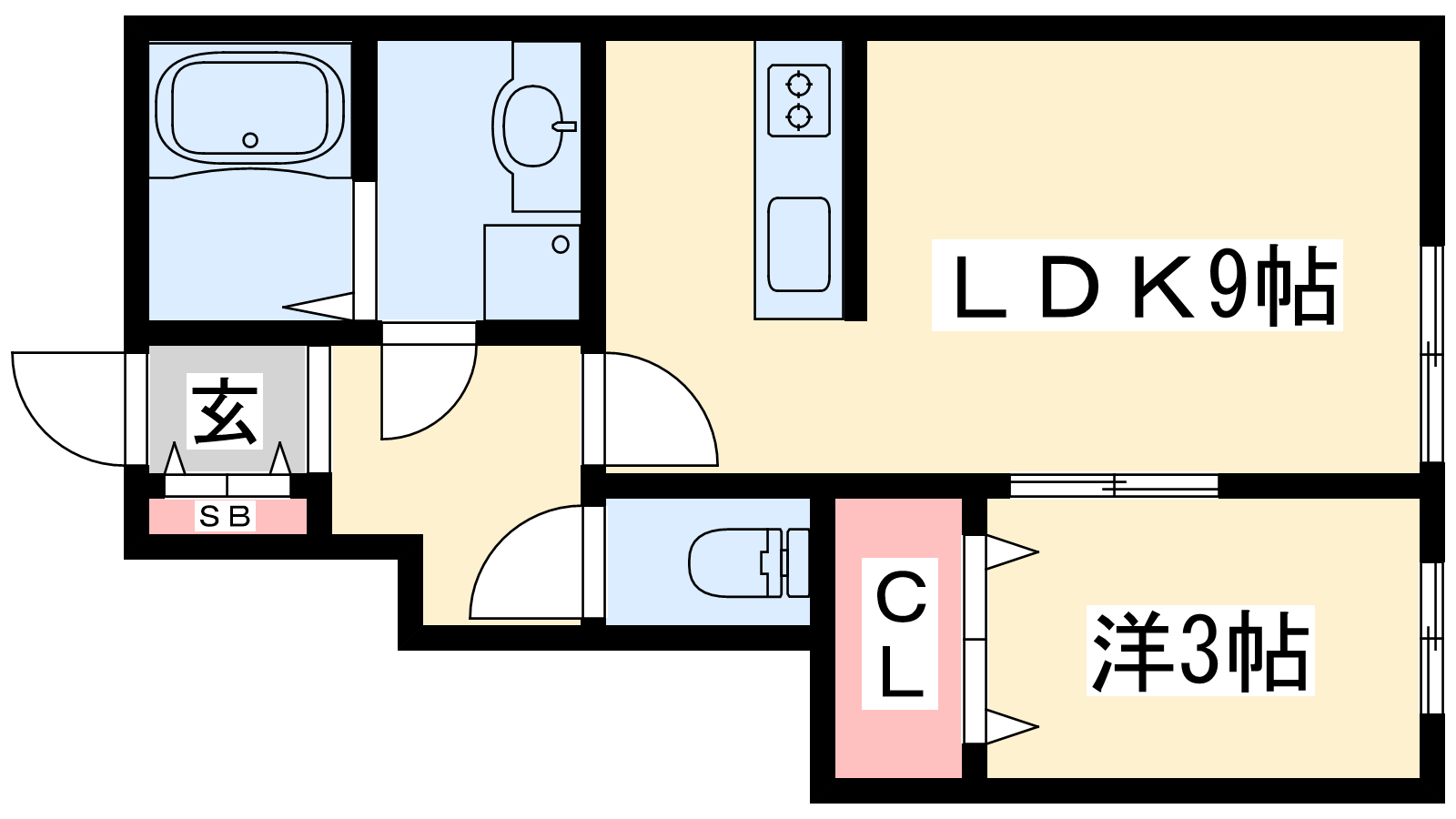 - LDK9帖、洋室3帖