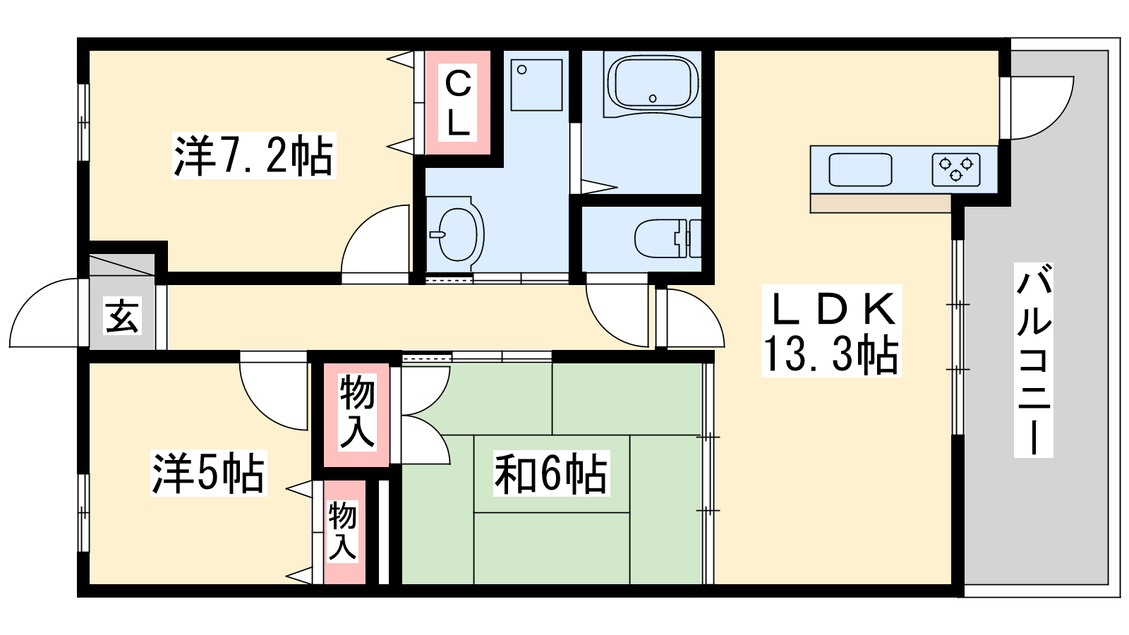 - LDK13.3帖、洋室7.2帖、洋室5帖、和室6帖
