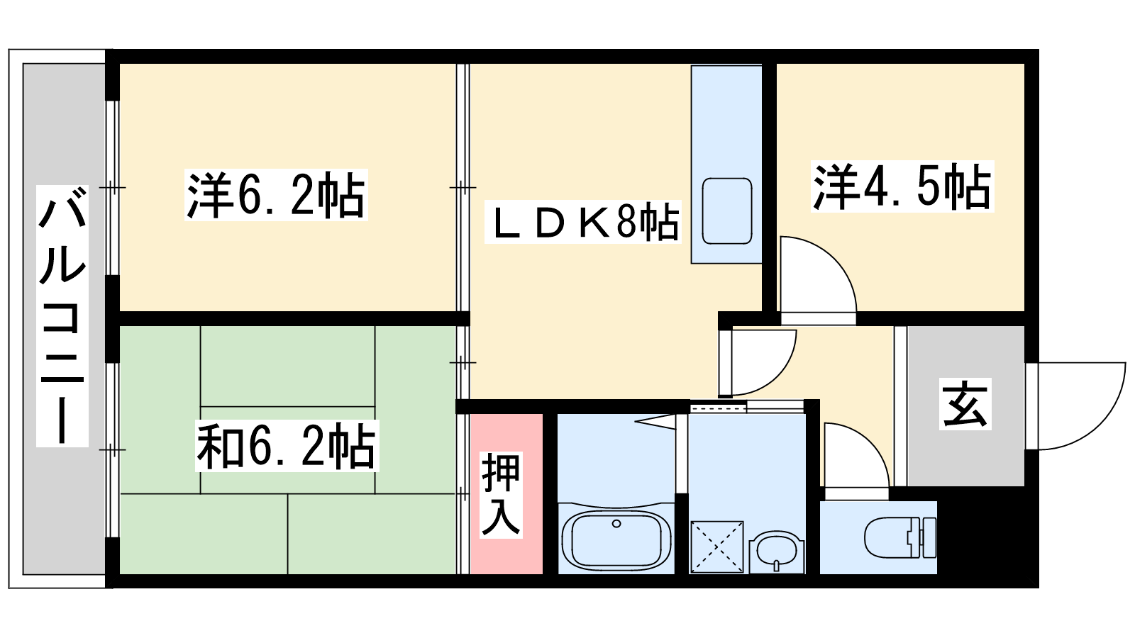 - LDK8帖、洋室6.2帖、和室6.2帖、洋室4.5帖