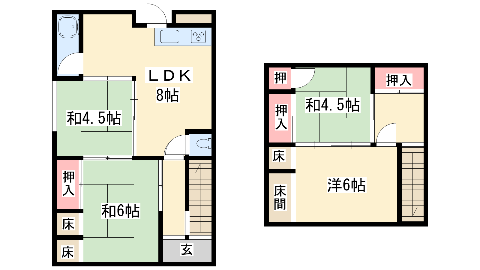 - 和室4.5帖、和室4.5帖、和室6帖、洋室6帖、DK8帖