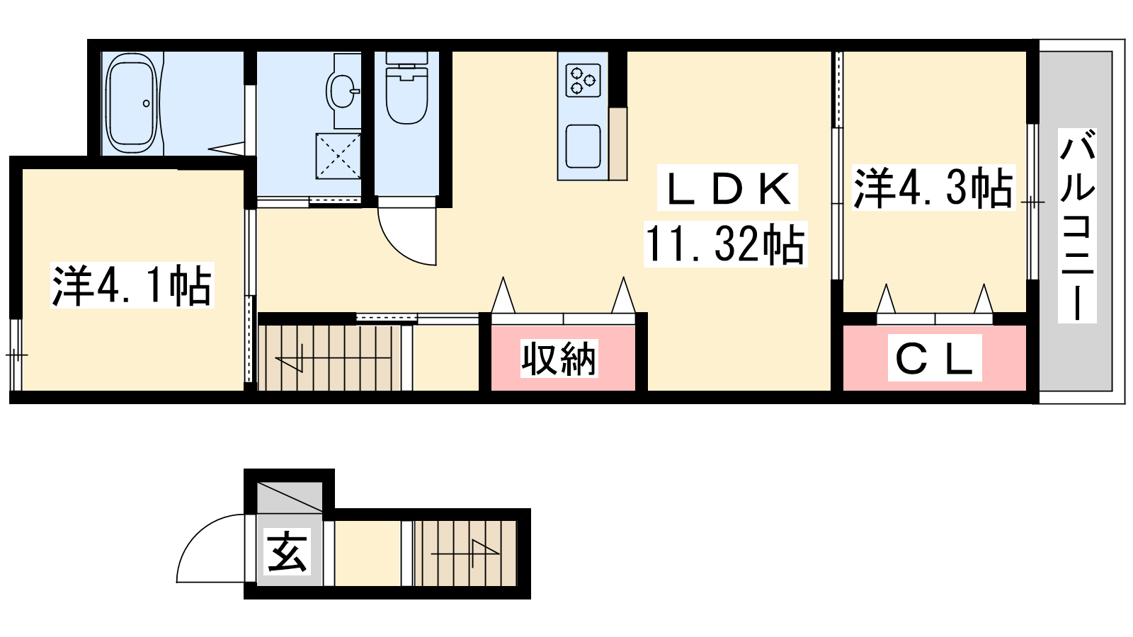 - LDK11.32帖、洋室4.3帖、洋室4.1帖