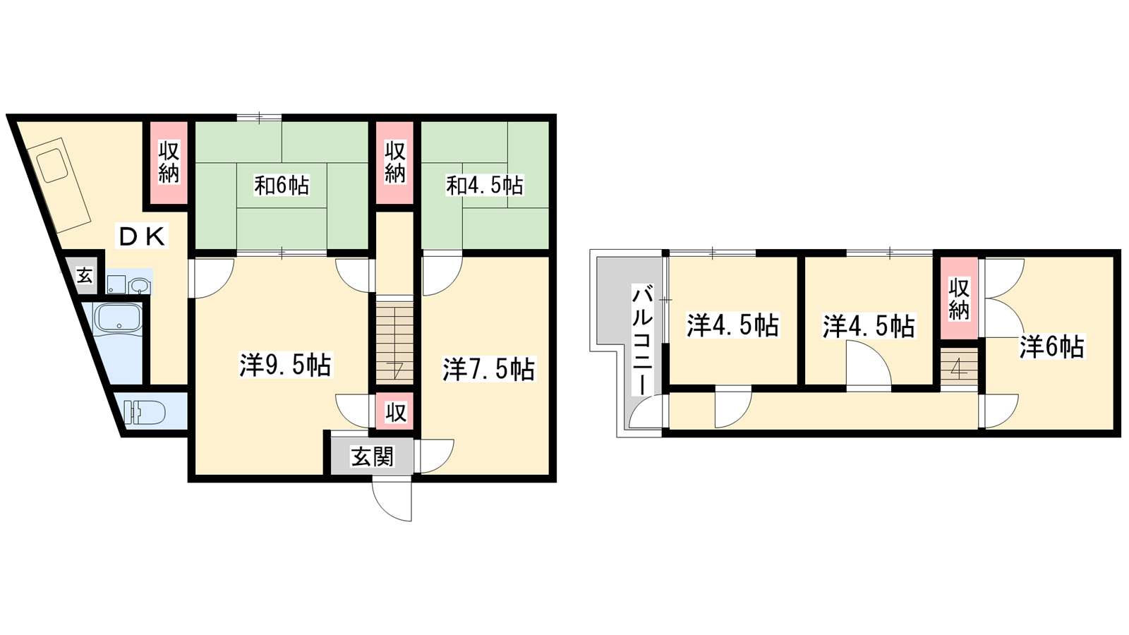 - DK4.5帖、洋室9.5帖、洋室7.5帖、洋室6帖、和室6帖、洋室4.5帖、洋室4.5帖、和室4.5帖