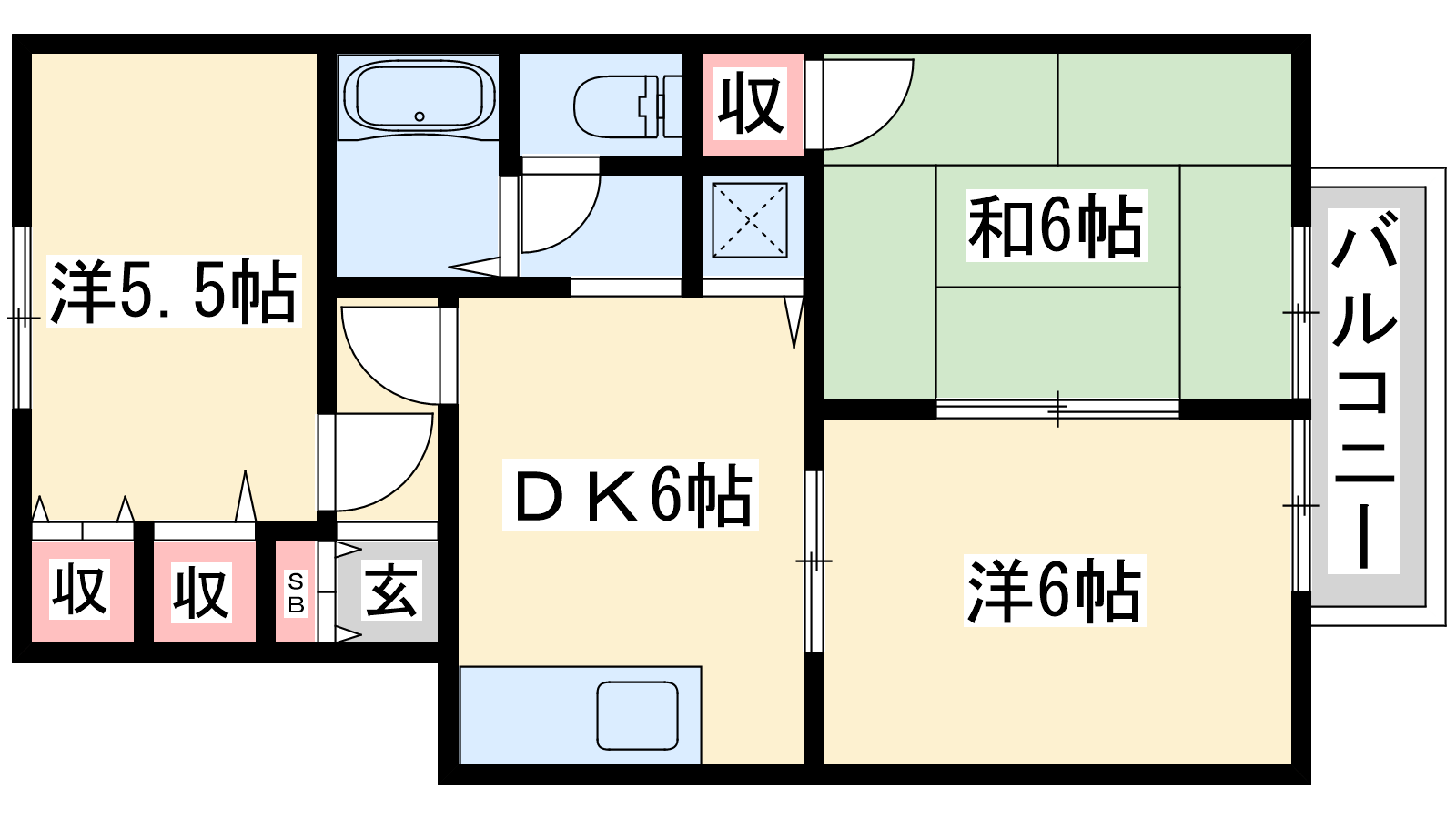 - DK6帖、洋室6帖、和室6帖、洋室5.5帖