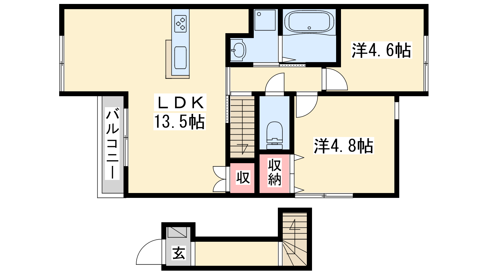 - LDK13.5帖、洋室4.8帖、洋室4.6帖