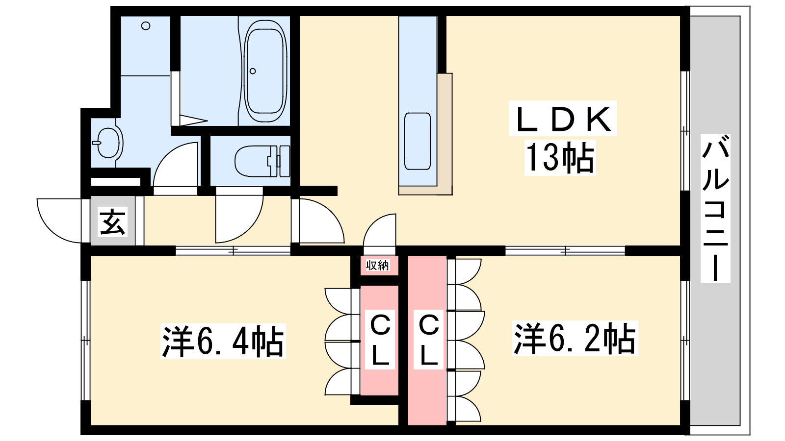 - LDK13帖、洋室6.4帖、洋室6.2帖