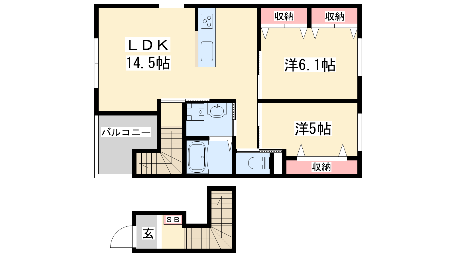 - LDK14.5帖、洋室6.1帖、洋室5帖