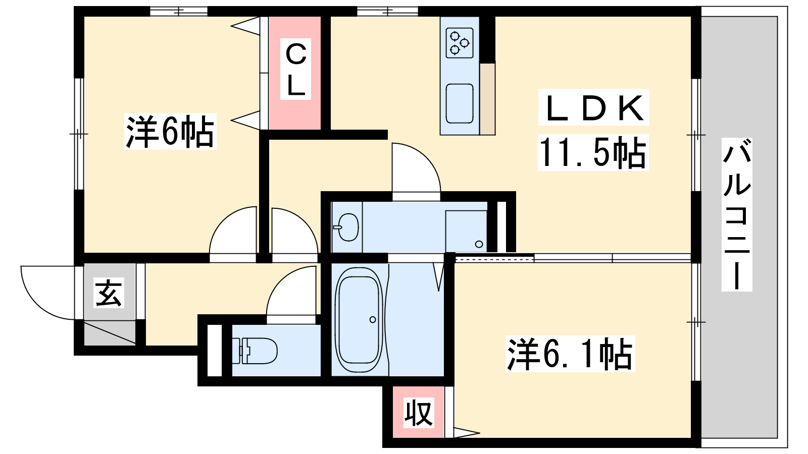 - LDK11.5帖、洋室6.1帖、洋室6帖