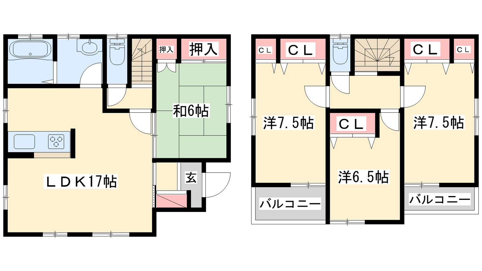- LDK17帖、洋室6.5帖、洋室7.5帖、洋室7.5帖、和室6帖