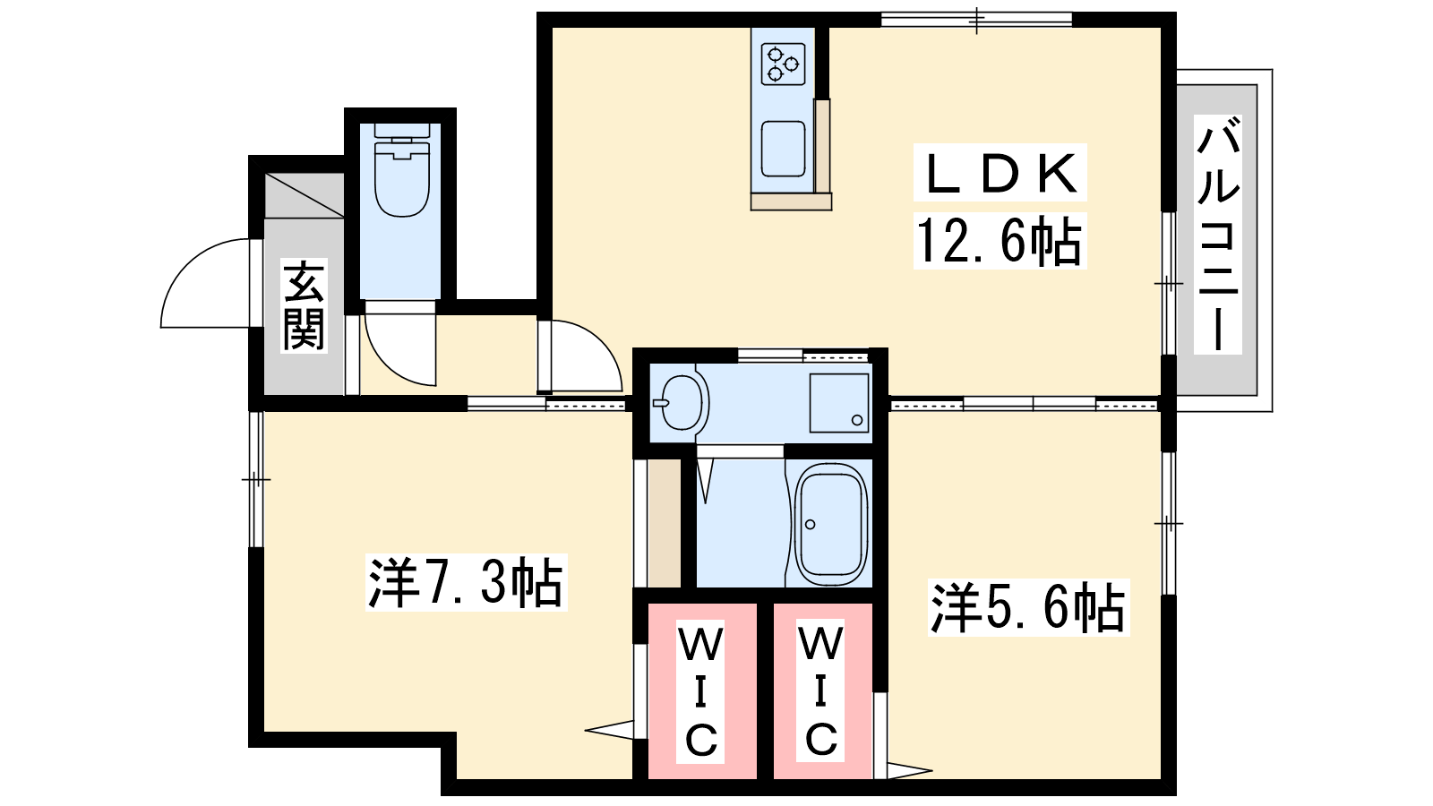 - LDK12.6帖、洋室7.3帖、洋室5.6帖