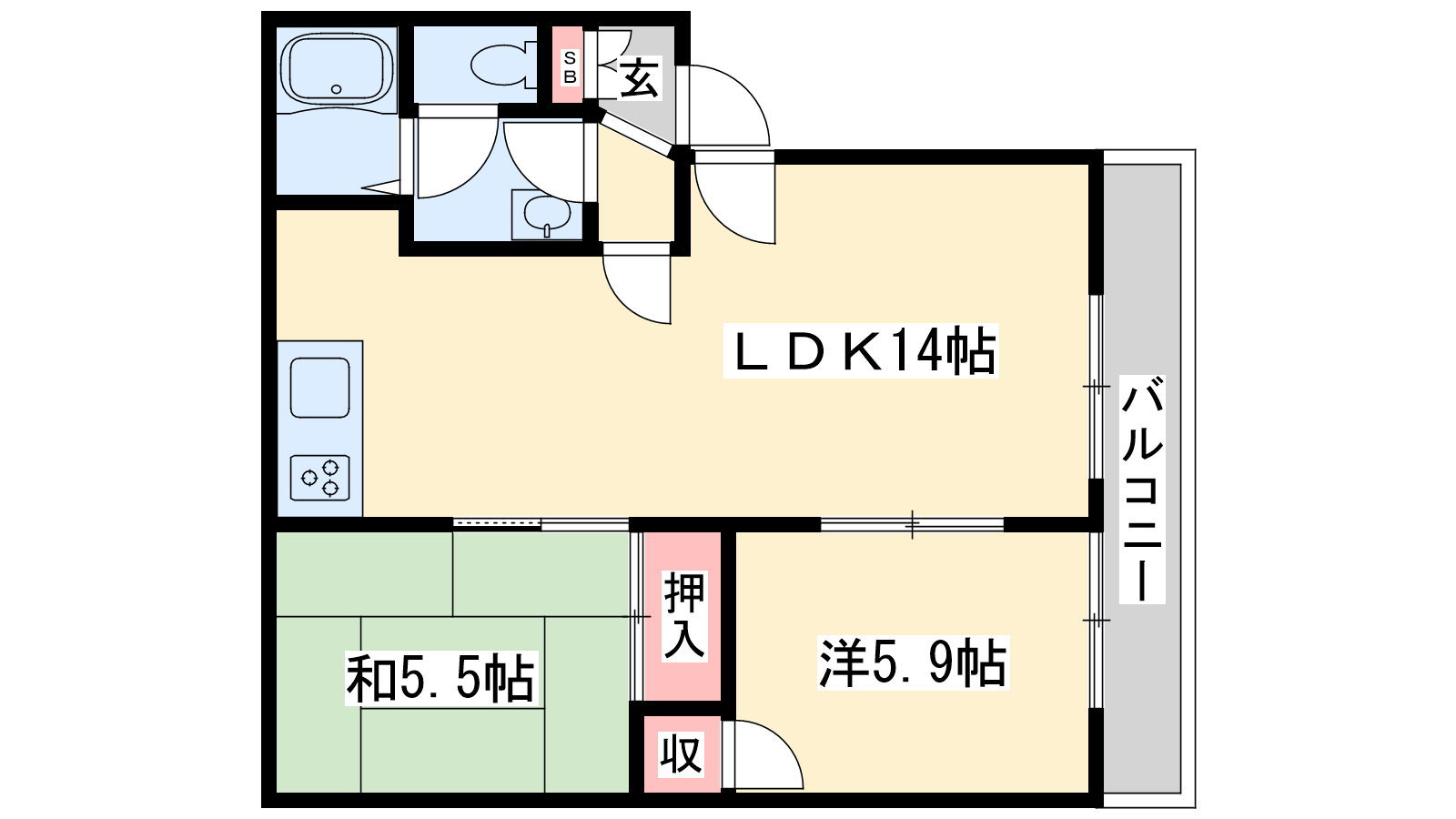 - LDK14帖、洋室5.9帖、和室5.5帖