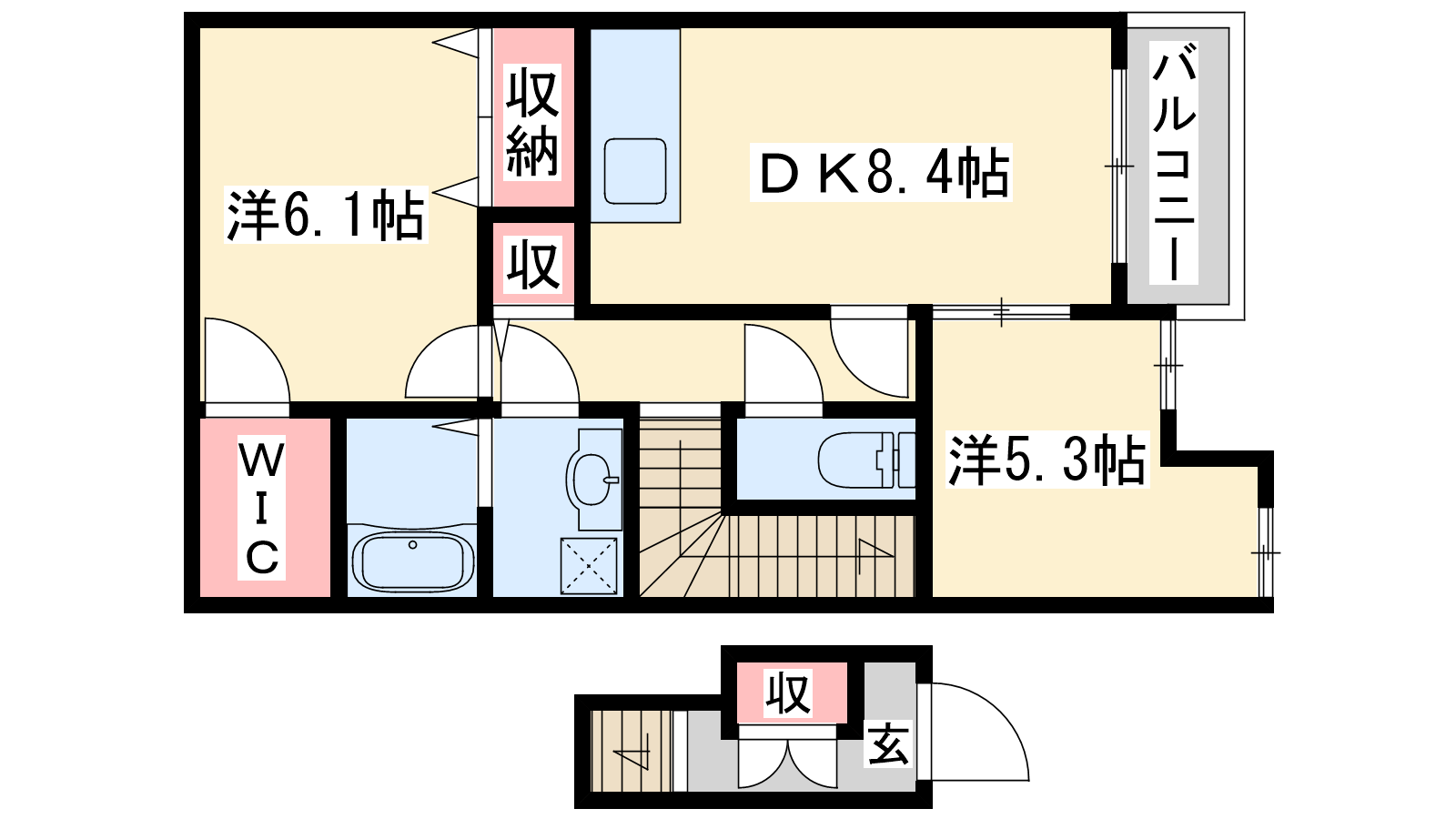- DK8.4帖、洋室6.1帖、洋室5.3帖