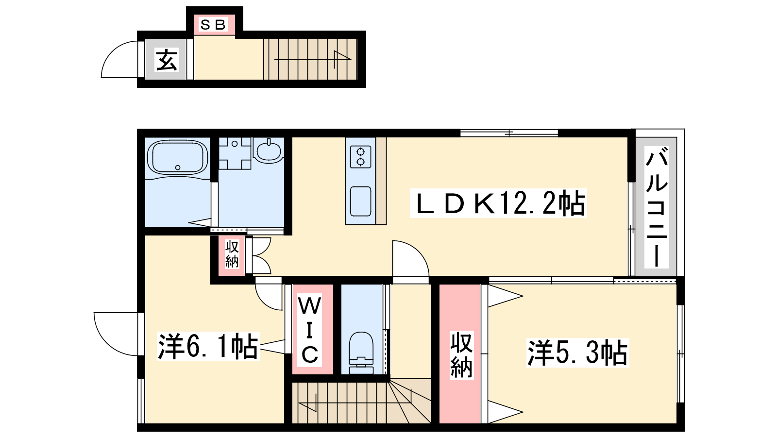 - LDK12.2帖、洋室6.1帖、洋室5.3帖